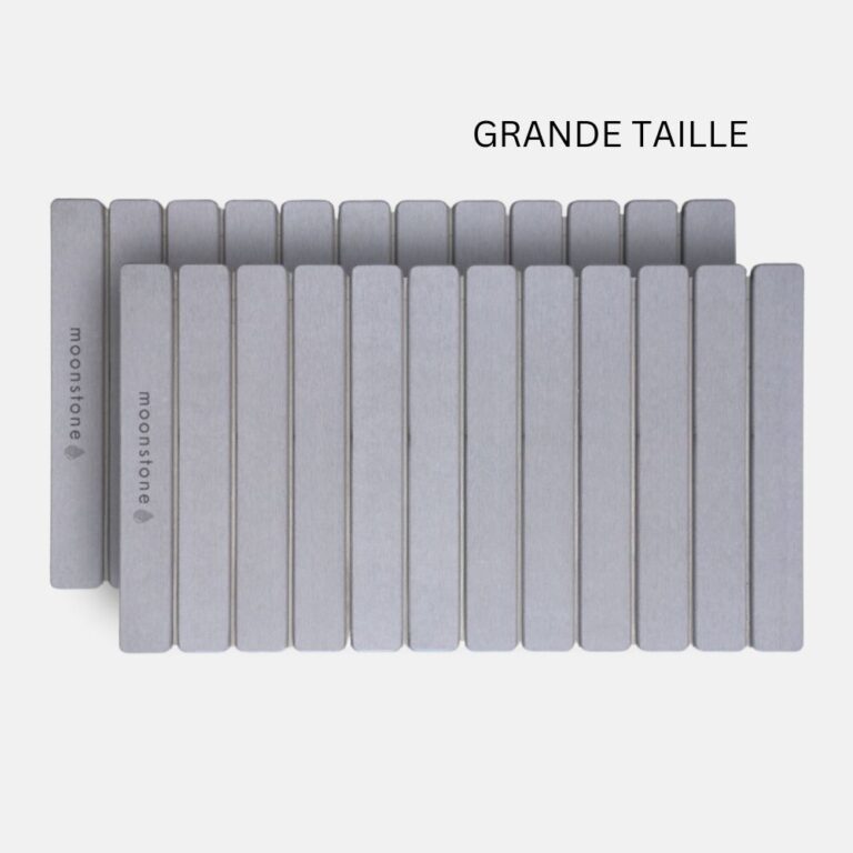 La diatomite utilisée par Moonstone™️ est purifiée, naturelle et sans danger pour la peau, même la plus sensible. Elle ne contient aucun produit chimique agressif et peut être utilisée sans crainte par toute la famille. C’est un matériau écologique et sain, parfaitement compatible avec une salle de bain familiale.