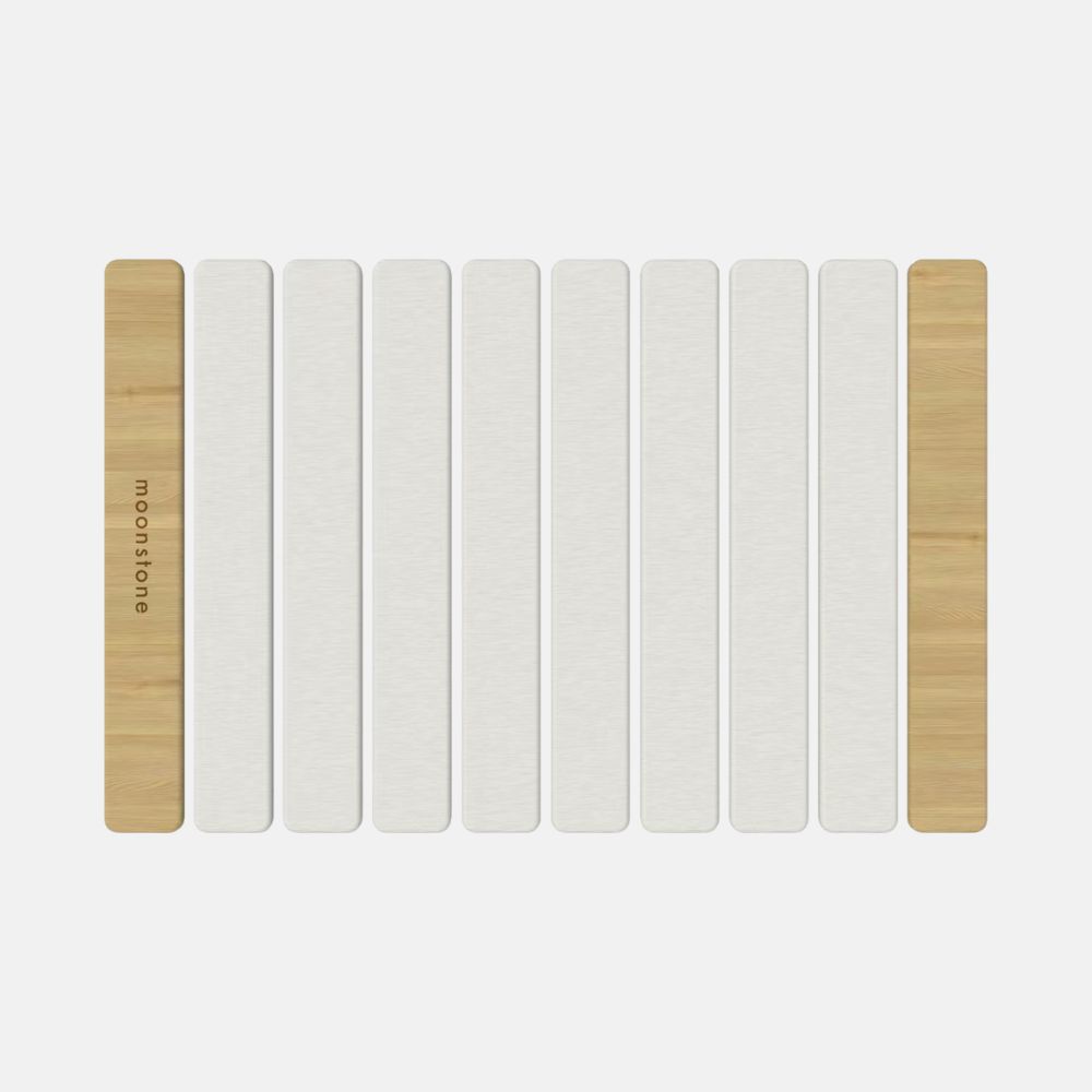 La diatomite utilisée par Moonstone™️ est purifiée, naturelle et sans danger pour la peau, même la plus sensible. Elle ne contient aucun produit chimique agressif et peut être utilisée sans crainte par toute la famille. C’est un matériau écologique et sain, parfaitement compatible avec une salle de bain familiale.