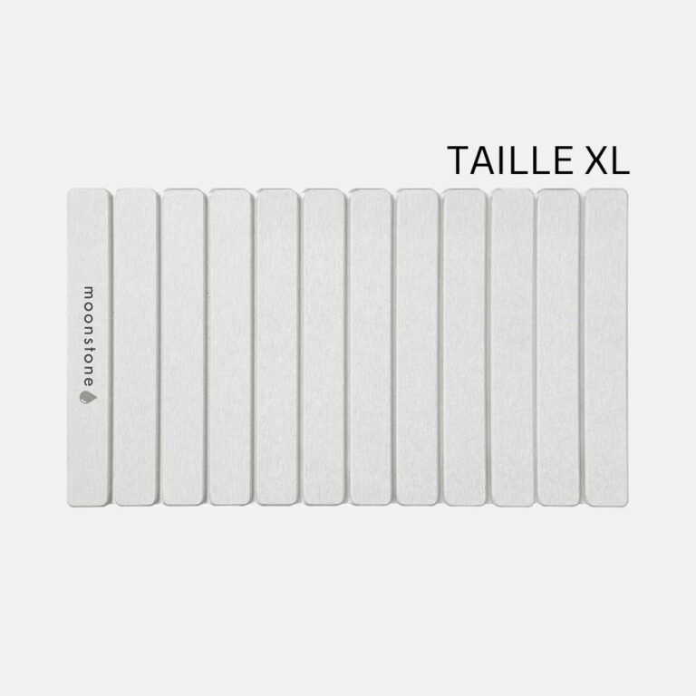 La diatomite utilisée par Moonstone™️ est purifiée, naturelle et sans danger pour la peau, même la plus sensible. Elle ne contient aucun produit chimique agressif et peut être utilisée sans crainte par toute la famille. C’est un matériau écologique et sain, parfaitement compatible avec une salle de bain familiale.
