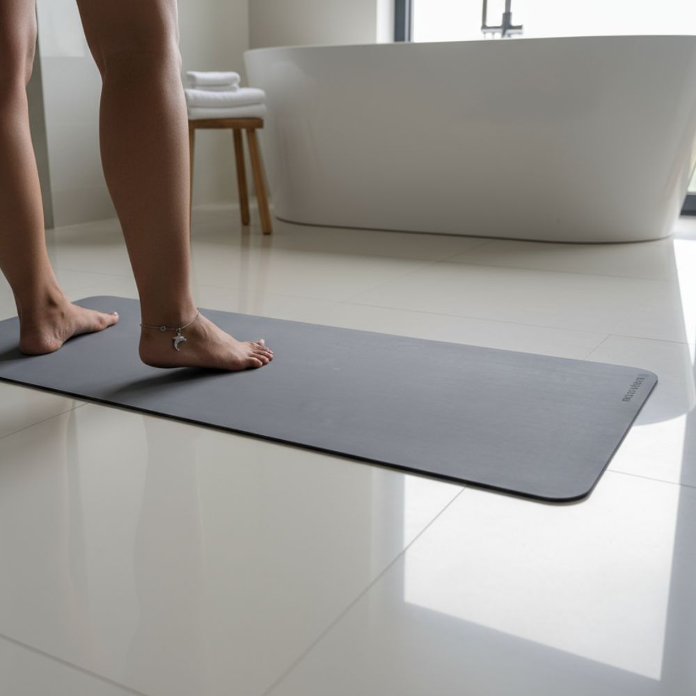 Nos tapis en diatomite Moonstone™️ sont antidérapants, absorbants et séchent en quelques secondes, ce qui réduit fortement les risques de glissade. Leur surface reste stable, même humide, offrant une sécurité optimale pour les enfants qui courent après le bain, ou les personnes âgées qui nécessitent un sol sec et sûr.