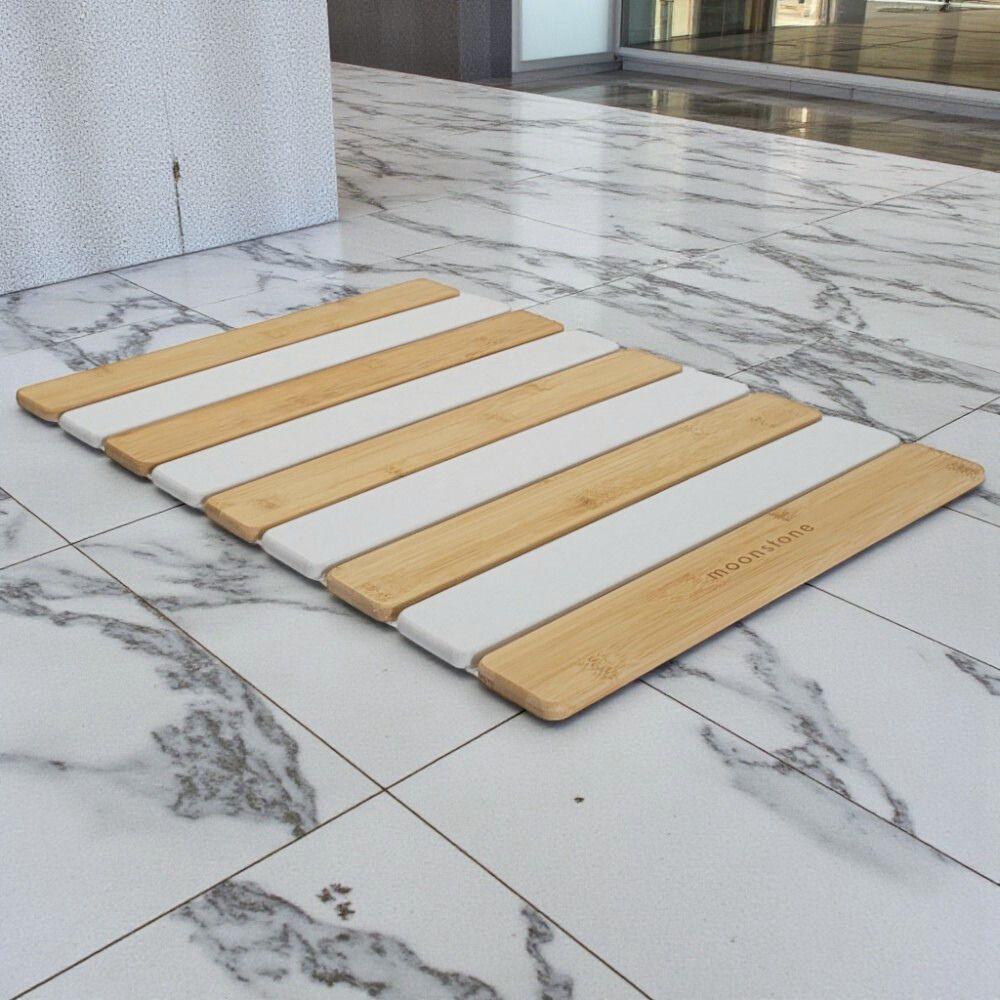 🌿 Absorption rapide et naturelle – La diatomite capte instantanément l’humidité, évitant les flaques d’eau, tandis que le bambou offre une surface saine et respirante.